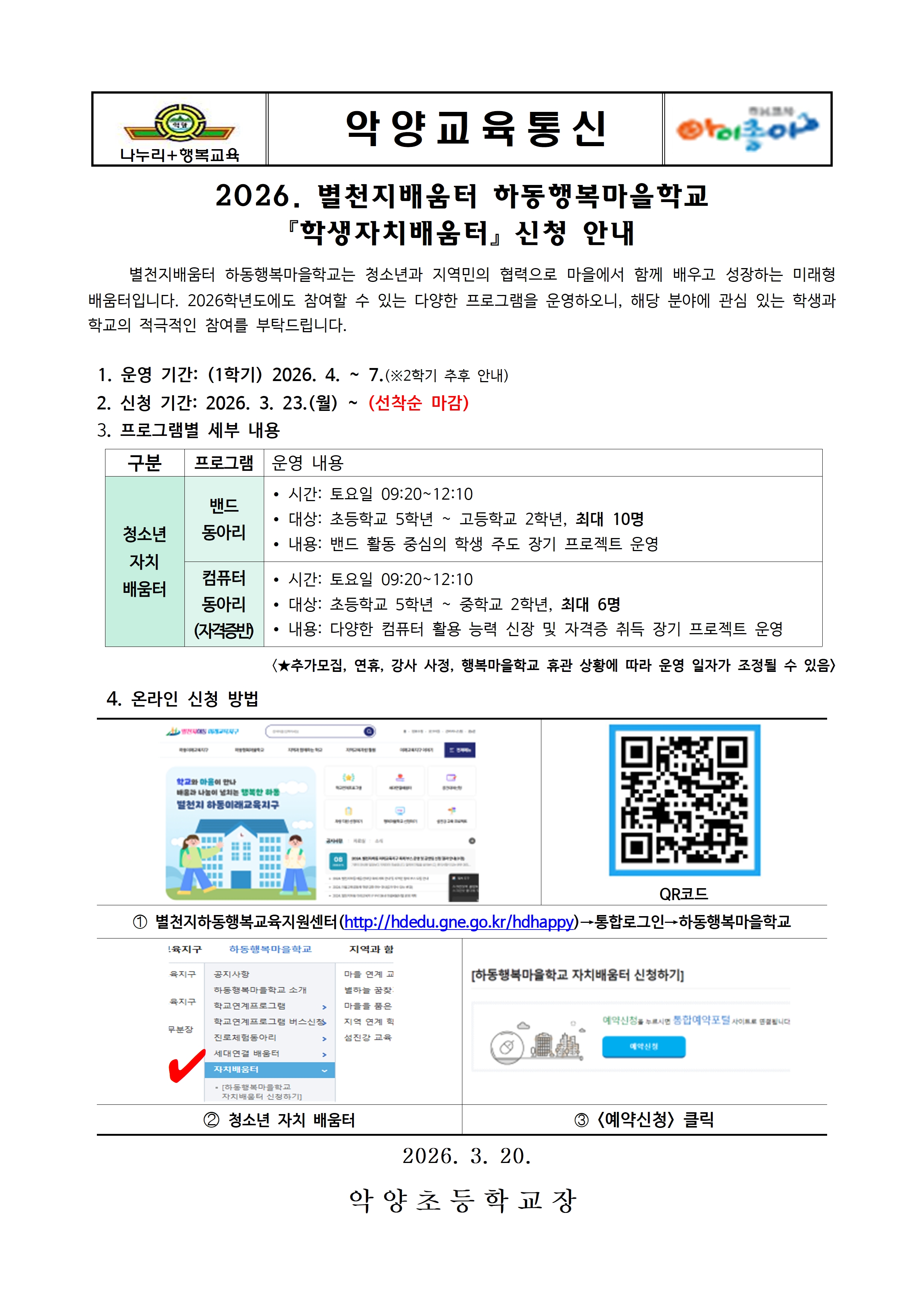 2026. 별천지배움터 하동행복마을학교 『학생자치배움터』 신청 안내(5학년~6학년)