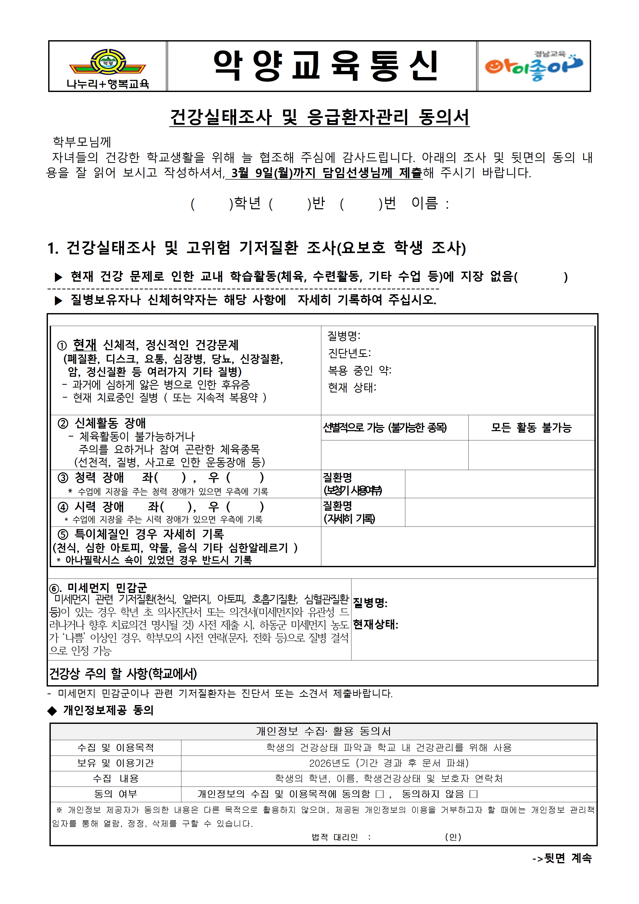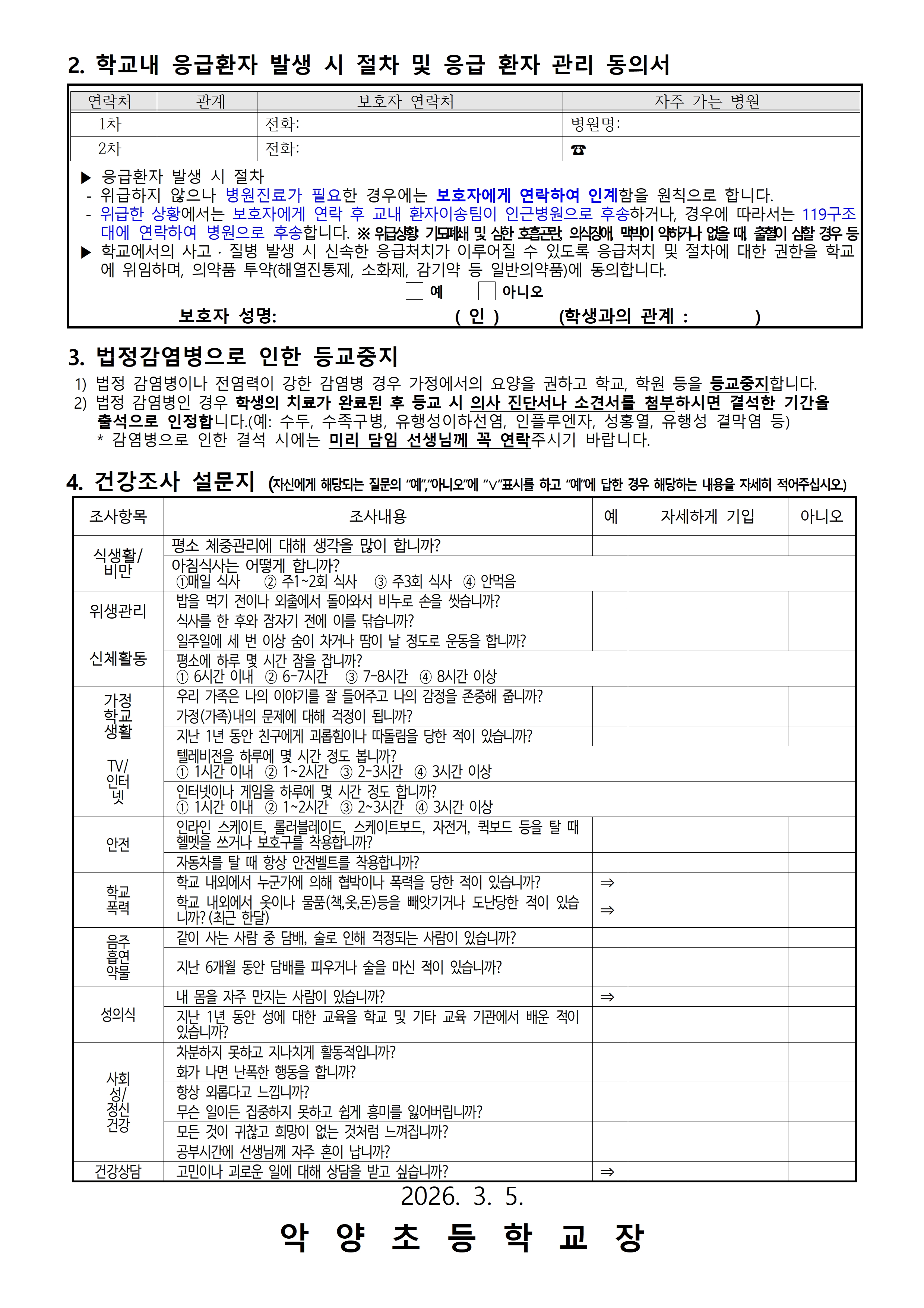 건강실태조사 및 응급환자관리 동의서 안내
