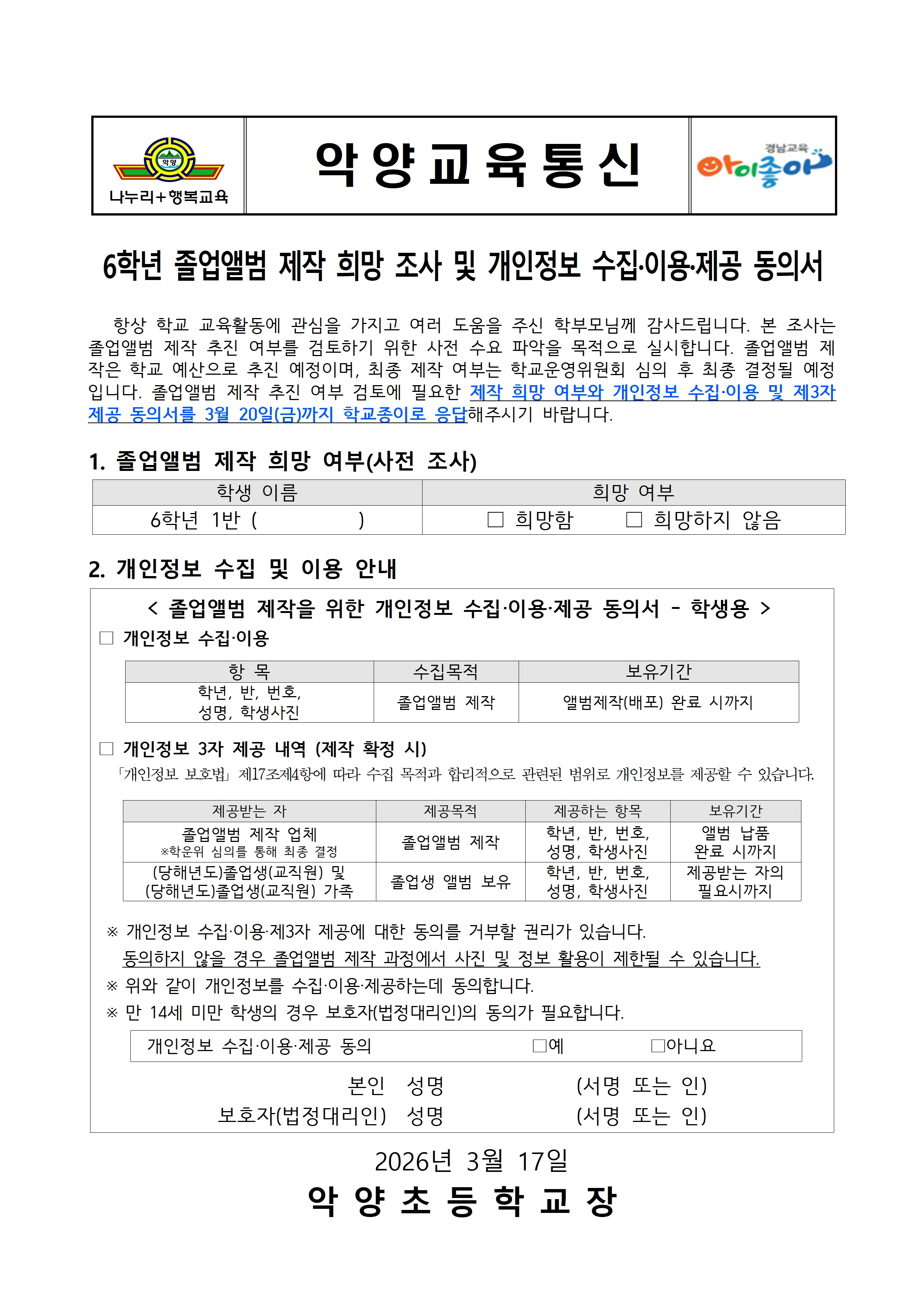 6학년 졸업앨범 제작 희망 조사 및 개인정보 수집·이용·제공 동의서 안내(6학년)